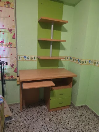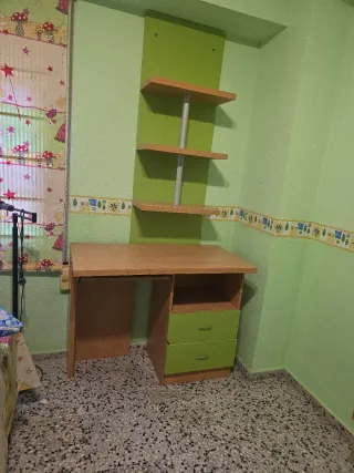 Escritorio con estantería superior y dos cajones. - Superficie de madera. - Estructura de madera y plástico. - Dos cajones de color verde.