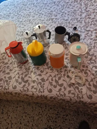 Conjunto de varios utensilios de cocina, incluyendo cafeteras italianas y termos. - Cafeteras de aluminio. - Termos de diferentes colores y tamaños. - Un émbolo para cafetera o prensa francesa.