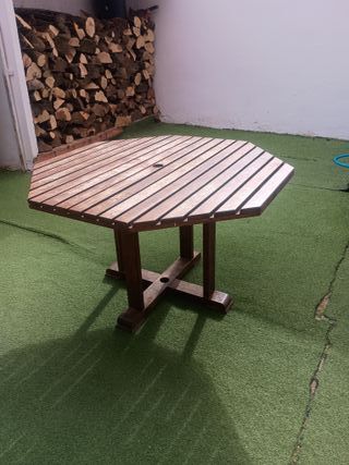 Mesa octogonal de teca, perfecta para exteriores. - Diseño de listones. - Agujero central para sombrilla.