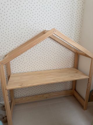 Escritorio infantil de madera con diseño de casita. Ideal para habitaciones infantiles. - Estructura de madera natural. - Diseño de casita con tejado. - Superficie de escritura amplia. Pequeña grieta en tabla (adjunto foto). No disponibles los tornillos de fijación de la tabla, pero se pueden encontrar fácilmente en Leroy Merlin.