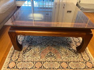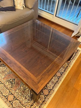 Elegante mesa de centro con estructura de madera maciza y superficie de cristal. - Diseño moderno y funcional. - Acabado en tonos marrones y transparente.