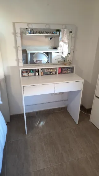 Tocador elegante con espejo y luces integradas. Perfecto para tu espacio de belleza. - Amplio espejo con iluminación. - Superficie de trabajo espaciosa. - Cajones para almacenamiento organizado.