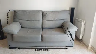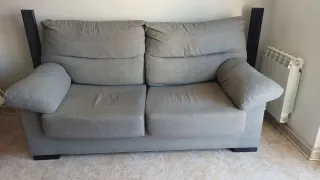 Sofá de dos plazas. Su diseño moderno y cómodo lo hace ideal para cualquier salón. - Tapicería de tela. - Color gris. - Estructura con detalles en madera oscura. - Usado con tela encima para no dañar la tapicería - Pequeño desperfecto en lateral inferior izq por rascada de gato