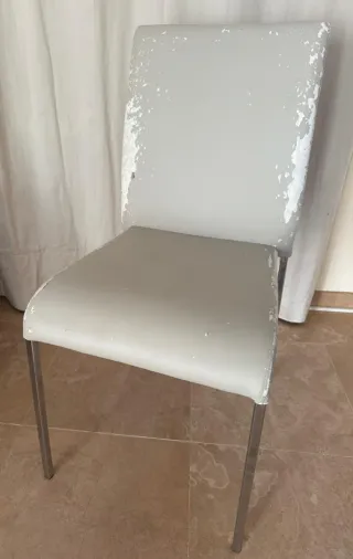 Conjunto de 6 sillas de comedor con un diseño moderno. - Patas de metal. - Tapicería de polipiel en mal estato - Regalamos 6 fundas - 35€ todas las sillas