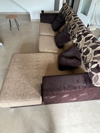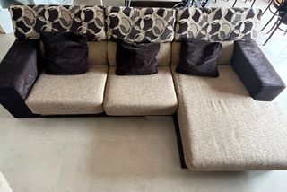 Cómodo sofá chaise longue con un diseño moderno y elegante. Sus cojines son amplios y cómodos. - Tapicería en tela de cor beige y marrón. -Cojines decorativos en color marrón oscuro. -Diseño modular con chaise longue