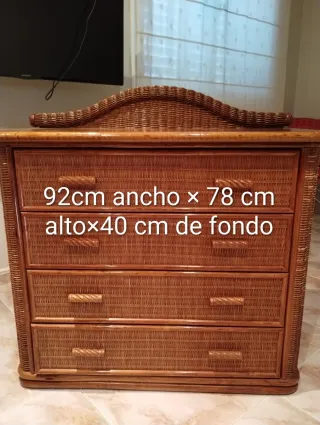 Cómoda de mimbre con cuatro cajones, ideal para dormitorio o salón. - Medidas: 92 cm ancho x 78 cm alto x 40 cm fondo. - Material: Mimbre y madera.
