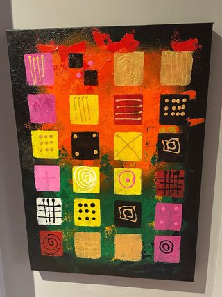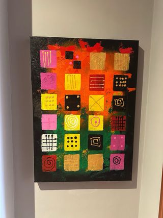Cuadro decorativo con un diseño abstracto y vibrante. - Lienzo con textura. - Patrones geométricos y orgánicos. - Tonos cálidos y fríos.