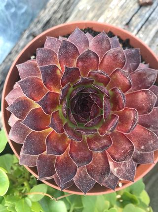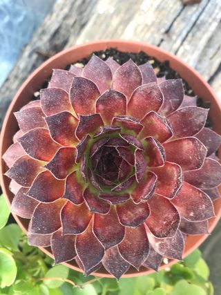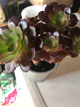 Planta suculenta de la variedad Aeonium velour. Sus hojas presentan un degradado de color verde a morado oscuro, con un acabado aterciopelado. - Hojas carnosas y dispuestas en roseta. - Ideal para coleccionistas de suculentas.