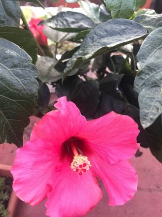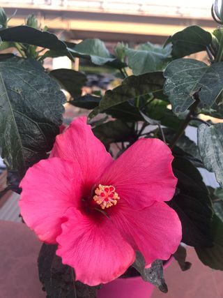 Flor de hibisco en tono rosa vibrante. Perfecta para añadir color a cualquier espacio. - 3 plantas en la maceta, la maceta entera 13€ - Pétalos grandes y llamativos. - Centro con estambres amarillos y rojos.
