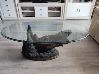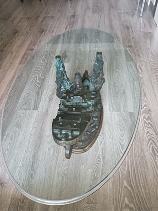 Original mesa auxiliar con sobre de cristal y base decorativa con forma de barco naufragando. - Diseño único y llamativo. - Ideal como pieza decorativa.