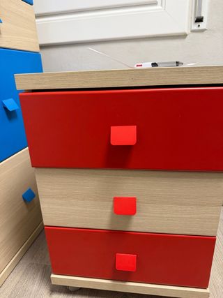 Conjunto de armarios de madera con detalles en rojo, perfectos para una habitación infantil. - Diseño moderno y funcional. - Tiradores rojos. - Estructura de madera clara.