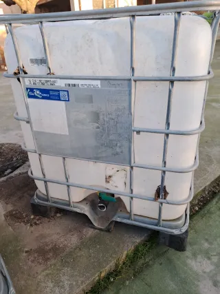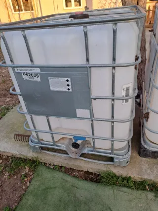 Bidón de 1000 litros con estructura metálica. 2 unidades - Capacidad: 1000 litros. - Material: Plástico blanco y jaula metálica. - Válvula de descarga.