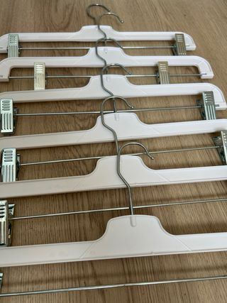 Pack de seis perchas diseñadas para colgar pantalones o faldas. - Cada percha cuenta con dos pinzas ajustables. - Diseño práctico para optimizar el espacio en el armario.