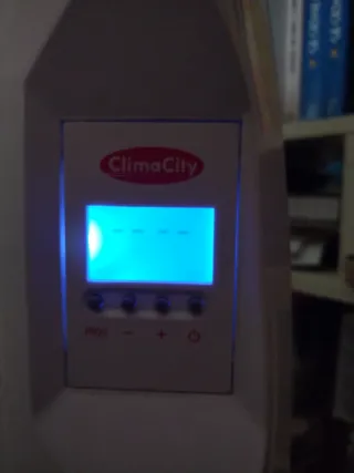 Radiador eléctrico Climacity. Enciende pero no calienta, necesita ser reparado. Diseño combina acabados en beige y blanco, aportando un toque moderno a cualquier estancia. No incluye soporte. - Estructura de metal y plástico.