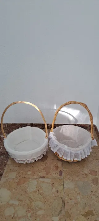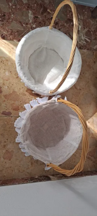 Conjunto de dos cestas de mimbre. Ideal para celebraciones como comuniones o bodas. Perfectas para decoración o almacenamiento. - Cestas con forro interior de tela. - Asas de mimbre trenzado.