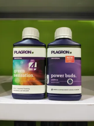 Se vende lote de dos productos de Plagron: Green Sensation 250 ml y Power Buds 250 ml - Green Sensation: Aditivo 4 en 1 que mejora la floración, resistencia, suelo y rendimiento. - Power Buds: Aditivo bioestimulante que aumenta la cantidad de brotes y acelera la floración.