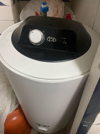 Termo eléctrico de la marca QCB, modelo Termos. - Color blanco. - Diseño cilíndrico. - Panel de control superior con dial.