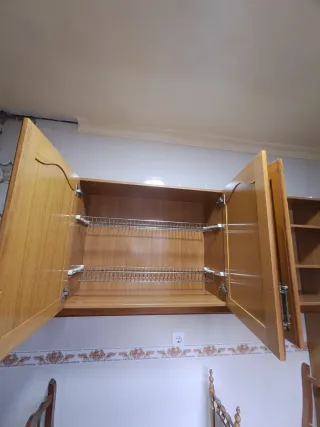 Mueble de cocina de madera con diseño clásico y tiradores - Incluye fregadero (3 años) - Vitrocerámica de 4 fuegos. Marca teka. Apenas usado - 9 puertas de distintos tamaños, con gran capacidad (algunos incluyen balda). - 4 cajones (40 cm de largo).