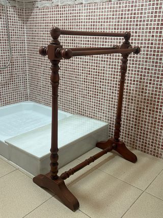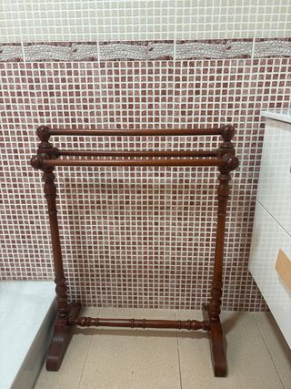Elegante toallero de madera con tres barras para colgar. - Diseño clásico y funcional. - Acabado en tono madera natural.