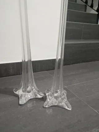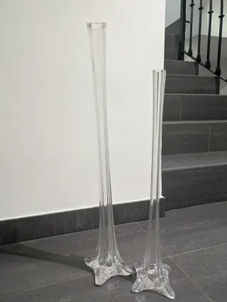 Elegante pack de dos jarrones altos de cristal. - Diseño esbelto y moderno. - Base ancha para mayor estabilidad. - Perfectos para centros de mesa o decoración. - Medidas 60cm y 50cm - El mas alto tiene un pequeño piquete es una esquina de la parte superior, de ahí su precio