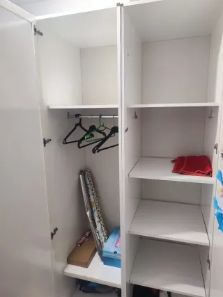 URGE VENDER POR MUDANZA Armario de madera con un diseño clásico y elegante. Es un armario de madera buena, costó muy caro en su día. No es de las de ahora de IKEA o similares que son aglomerados de madera. Hace 2'11m de alto / 59cm de fondo / 51cm ancho (cada módulo, los dos juntos 102cm - Puertas con lamas. - Tiradores plateados. Está en muy buen estado Incluye las estanterías y la barra que se ven en las fotos. EL ARMARIO ESTÁ EN UN TERCER PISO, LA PERSONA QUE VENGA A BUSCARLO TIENE QUE TRAER HERRAMIENTAS Y PERSONAL PARA DESMONTARLO Y BAJARLO SOLO VENTA EN PERSONA