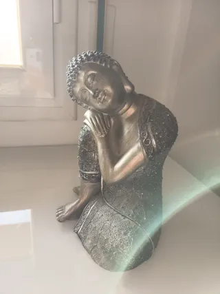 Figura decorativa de Buda en posición de meditación. Un detalle elegante para tu hogar. - Diseño intrincado en las vestiduras. - Acabado metálico con detalles en gris y plata.