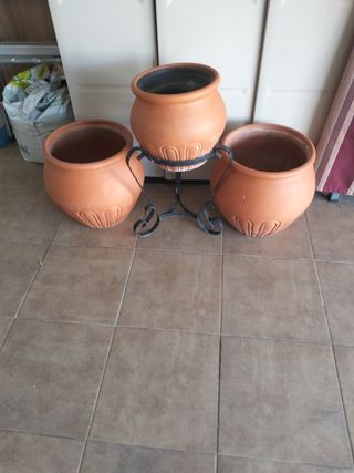 Juego de tres bonitos maceteros de cerámica color marrón claro con soporte de metal negro. Ideales para decorar tu hogar u oficina. - Tres macetas de terracota. - Soporte de metal resistente. - Diseño elegante y clásico.