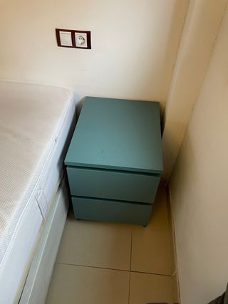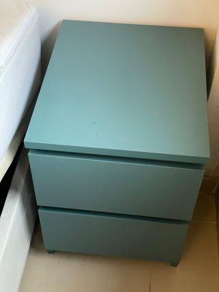 Dos mesitas de noche con un diseño moderno y elegante. - Acabado en color azul verdoso. - Fabricada en madera. - Una de ellas presenta signos de uso evidentes.