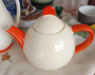 Preciosa tetera , vistosa, antigua, de cerámica con un diseño texturizado y detalles en naranja. La jarra de leche y/o agua y la tetera, las dos piezas juntas son 40€ - Pieza de colección. - Acabado brillante.