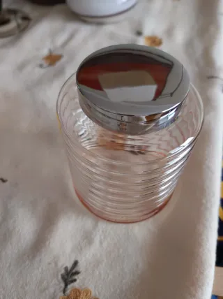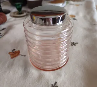 Bote de cristal rosa con tapa metálica