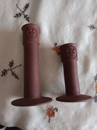 Conjunto de dos candelabros de Gustavsberg con un diseño clásico. - Fabricados en terracota. - Color marrón. - Cada candelabro tiene un detalle grabado con un motivo vegetal en forma circular.