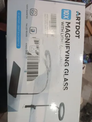Lámpara de aumento ARTDOT con luz LED y base estable. - Lupa de 10x de aumento. - Diámetro de 12 cm. - 144 cuentas LED. - Base estable para colocar en superficies. - Diseño moderno en blanco y negro.