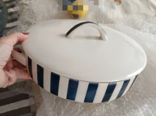 Fuente de cocina de loza de la marca Granit, fabricada en Hungría. Presenta un diseño clásico con rayas azules y blancas. - mide 26.50 x 6 cm de alto - Material: Cerámica. - Color: Azul y blanco. - la tengo de adorno hace tiempo, creo que aún se puede cocinar en ella