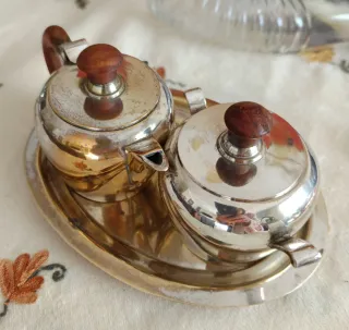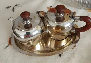 Elegante juego de tetera y azucarero con un diseño clásico. - Acabado metálico brillante. - Tapas y asas de madera. - Incluye bandeja a juego. - estado perfecto, algo manchado