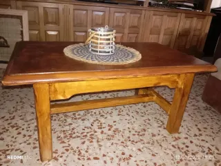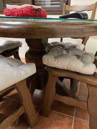 Mesa madera maciza roble. Le puse un cristal para no dañar la mesa, se puede dejar o quitar. Diámetro = 110 cm Alto = 76 cm