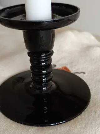 Elegante candelabro de cristal sueco en color negro. Su diseño clásico aportará un toque de distinción a cualquier espacio. - Pie de candelabro con detalles. - Base ancha para mayor estabilidad. - mide 10 cm de base y de alto 9 cm.