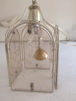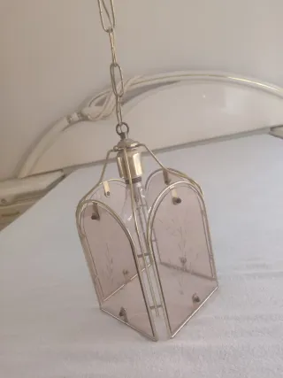 Elegante lámpara colgante con detalles decorativos. - Estructura metálica con acabado dorado. - Paneles de cristal tintado con grabado floral. - Detalle de campana dorada en el interior.