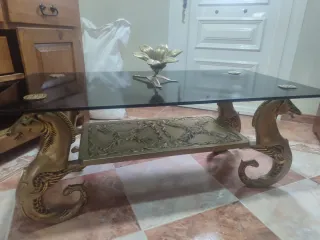 Elegante mesa de centro con un diseño vintage único. - Tablero de cristal negro. - Base y patas decorativas en forma de caballitos de mar dorados. - Detalle ornamental en la parte inferior.