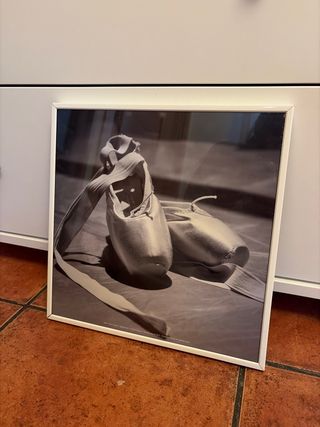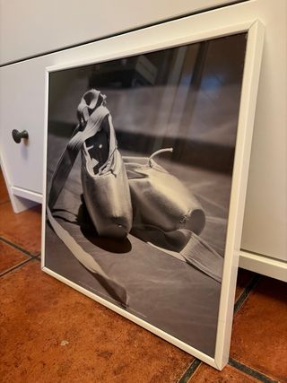 Imagen enmarcada de unas punteras de ballet. Ideal para amantes de la danza. - Marco blanco. - Fotografía en blanco y negro.