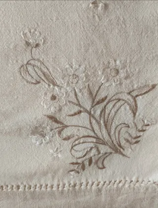Elegante mantel antiguo con un delicado bordado floral. - Diseño floral bordado en tonos beige y marrón. - Confeccionado en lino de alta calidad. - Aporta un toque vintage a tu mesa. - el mantel de lino tiene más de un siglo, el bordado, precioso, es posterior, está a este precio porque no tiene servilletas. - mide 2,40 x 1,60 - tiene alguna manchita de hierro por estar guardado mucho tiempo