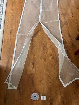 Mosquitera magnética para puertas, ideal para mantener los insectos fuera. Medidas : 2,50 m x 0,80 m Se instala- desinstala fácilmente con velcro autoadhesivo. NUEVA. La compramos y al final no la instalamos. Se puede recortar y adaptar facilmente a otra medida de puerta si sabeis coser un doblete. Blanca para no perder luz !