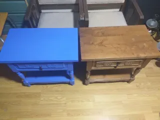 Conjunto de dos mesitas de noche de madera, perfectas para añadir un toque de estilo a tu dormitorio. Una está pintada en un vibrante color azul y la otra conserva su acabado natural en tono marrón. - Diseño clásico con un cajón. - Estante inferior para almacenamiento adicional. - Tiradores decorativos en los cajones.