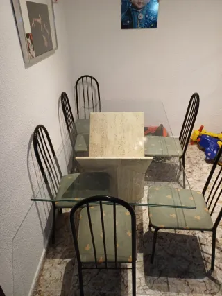 Conjunto de mesa con sobre de cristal y base de mármol, acompañado de seis sillas.