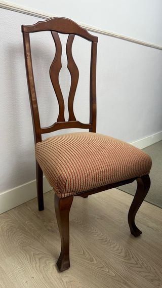 Conjunto de 6 sillas con estructura de madera de cerezo, patas delanteras isabelina. Asiento tapizado. - Diseño clásico con respaldo curvo. - Tapicería a rayas en tonos rojos y beige. - Patas delanteras curvas y traseras rectas.