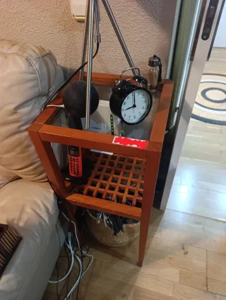 Mesa auxiliar OLSERÖD de IKEA. Medidas: 53 x 50 cm. Acabado efecto abedul. Incluye compartimento lateral de tela. Presenta algún pequeño defecto de uso en el tablero (ver fotos). Comprada en abril de 2024 (~1,5 años de uso). PVP: 40 €. Solo recogida en Móstoles.