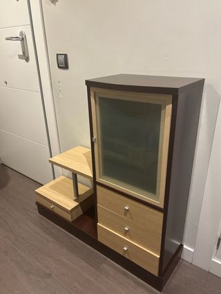 Mueble de entrada con un diseño moderno y funcional. - Combinación de madera clara y detalles en marrón oscuro. - Puerta acristalada con marco de madera. - Cajones de madera con tiradores metálicos.