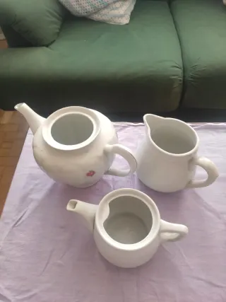 Conjunto de tres piezas de vajilla con algunos desperfectos. - Una tetera con un pequeño detalle floral. - Una lechera. - Una cafetera.