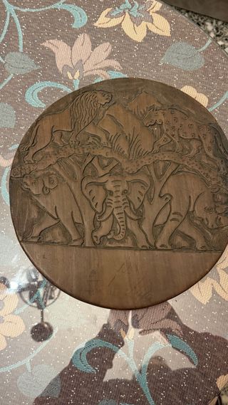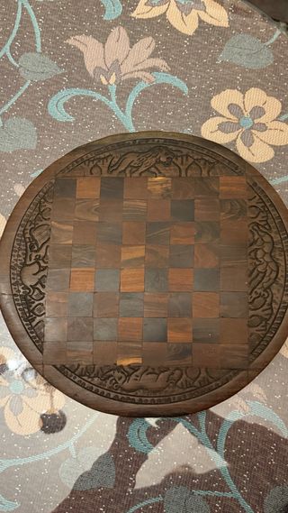 🪵 Tablero de ajedrez artesanal de madera – doble cara tallada – vintage Vendo tablero de ajedrez artesanal de madera maciza, redondo y de doble cara. • Una cara con tablero de ajedrez hecho con maderas contrastadas • La otra cara con talla en relieve de animales (elefante, león, leopardo), estilo africano / étnico • Pieza sólida y pesada, no es contrachapado Características: • Grosor: aprox. 4 cm • Peso: aprox. 1 kg • Diámetro: grande (tipo plato grande) • Época: años 60–80 (vintage) • Estado: bueno, con leve pátina normal del tiempo Ideal como: • Tablero de ajedrez • Pieza decorativa UN POCO ARQUEADA POR EL TIEMPO