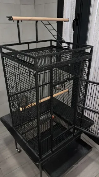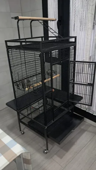 Jaula espaciosa para aves en perfecto estado. Ideal para mantener a tus mascotas cómodas y seguras. - Estructura metálica resistente. - 2 Bandejas extraíbles para facilitar la limpieza. - Incluye accesorios como perchas y comederos.