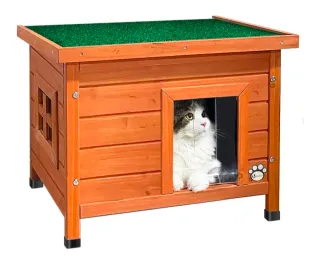 Acogedora casa de madera para gatos, perfecta para exteriores. Su diseño robusto y el tejado verde le dan un toque especial. -Tejado asfáltico - Construcción en madera. - Tejado con acabado verde.